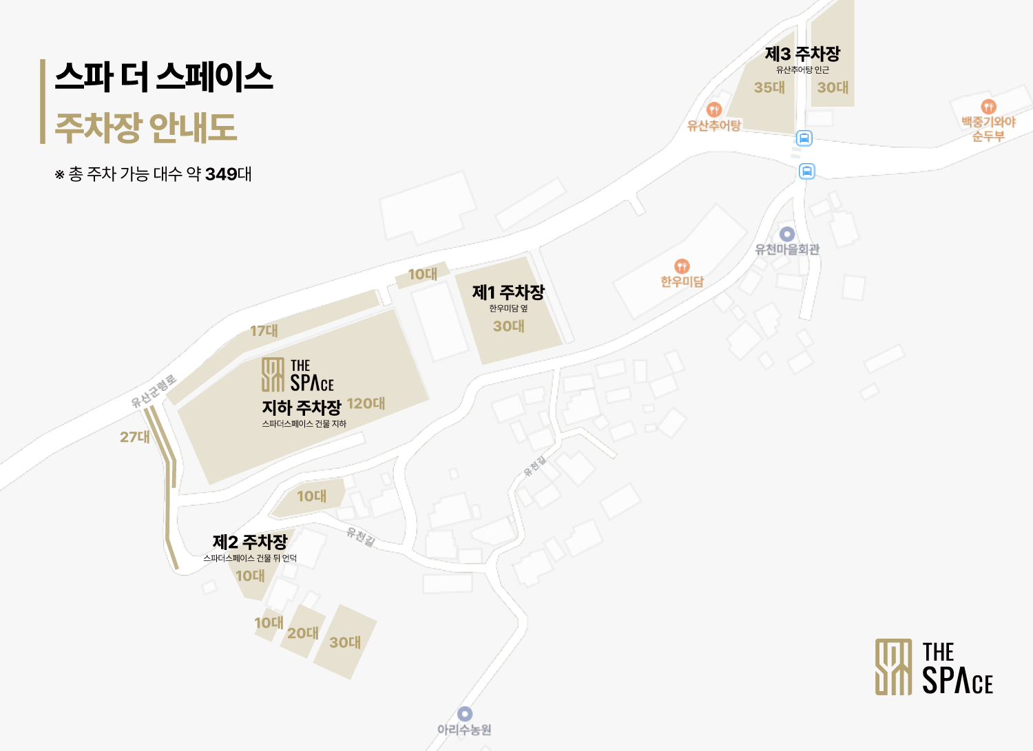 스파 더 스페이스를 방문해주시는 고객 여러분의 편의를 위해 주차장 위치 및 주차 가능 대수를 안내드립니다.